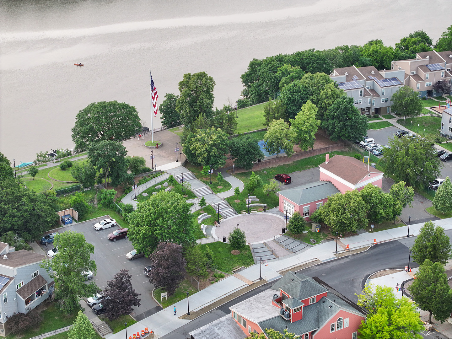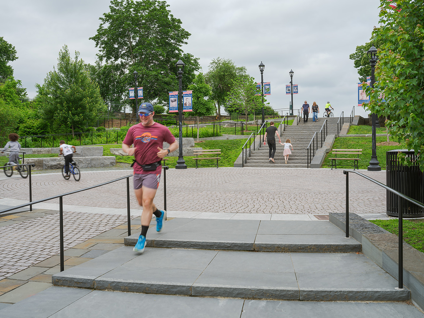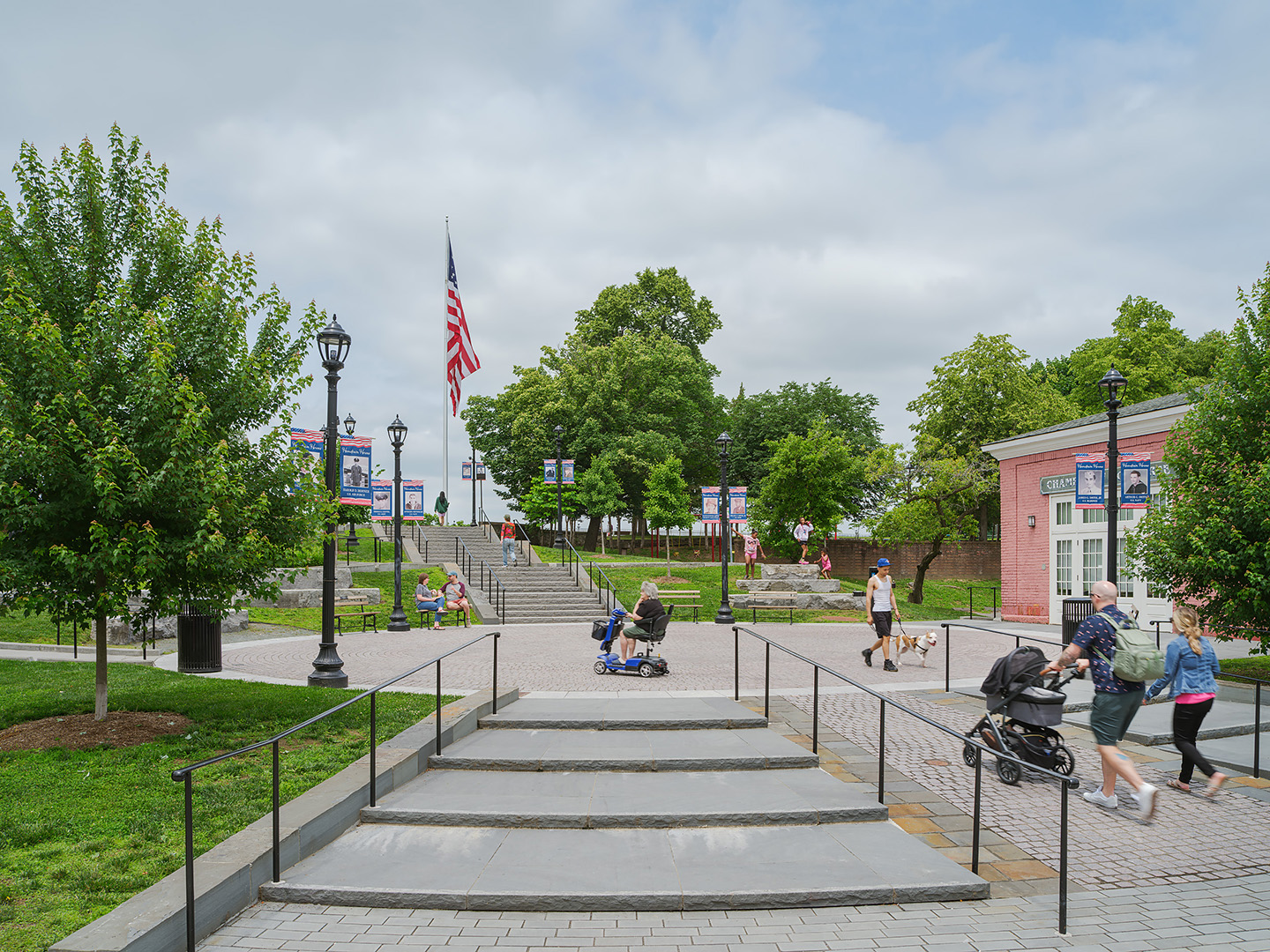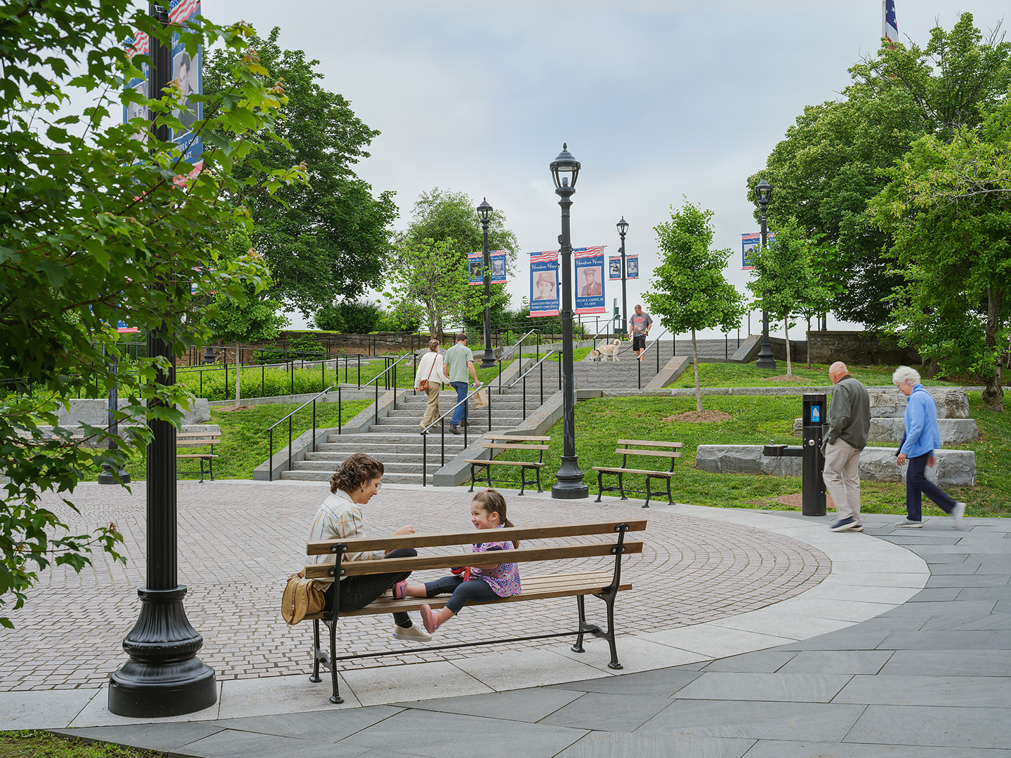Starr Whitehouse is leading the DRI-funded reconstruction of Hudson’s historic Promenade Hill Park. Engaging the community in socially-distanced workshops, our team developed strategies to make the promenade universally accessible, while carving out new programming and social spaces in one of the nation’s oldest public parks. Gently-sloped paths sweep along the park’s southern boundary, opening up the promenade to wheelchair access while avoiding critical root zones of existing trees. Set within the “oxbow” of these paths, expanded lawn areas add space for picnicking and gathering. A range of new programming clustered around the redesigned plaza expands activities in the park, including added tables for picnicking, stone slab seating, and a whale-themed spray shower for local children to play in on hot summer days.