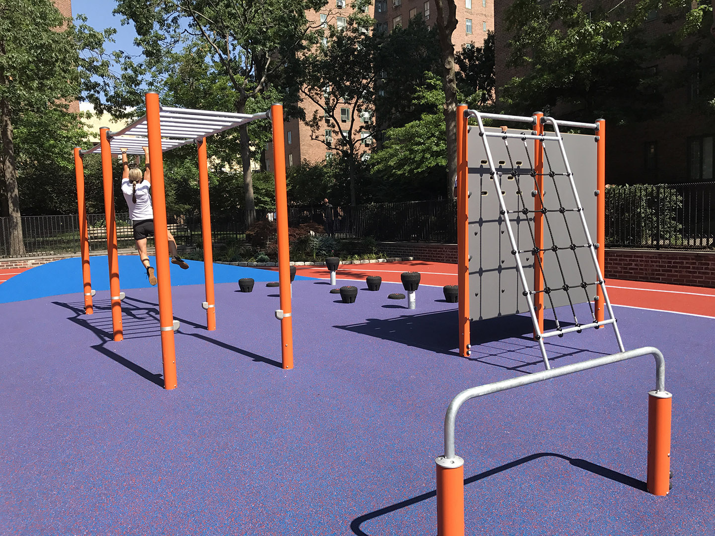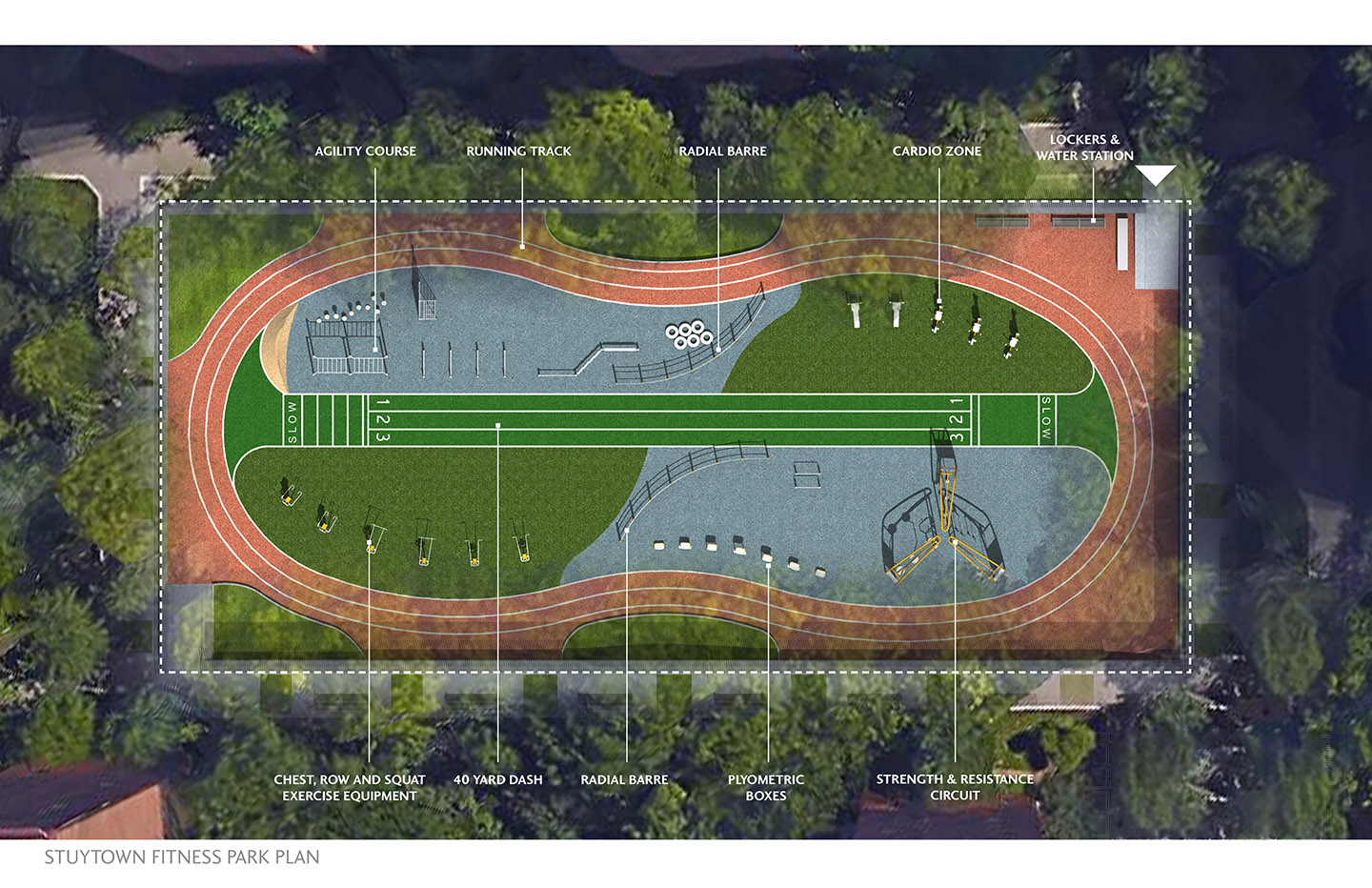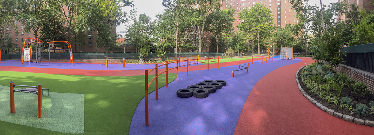 Starr Whitehouse was retained to redesign Playground 7 on the campus of StuyTown—an apartment community in Lower Manhattan. The project’s focus is to expand opportunities for physical activity to a resident population with a wide range of ages and abilities and integrate the site into the adjacent landscape. Responding to the challenge to craft an immersive active and social amenity with standardized equipment playing a supporting role, Playground 7 accommodates diverse physical and social activities and integrates the space into a natural landscape. A cushioned track and 40-yard dash connect exercise zones designed for core training, upper body strength, lower body strength, and cardiovascular workouts. Colorful bioswales contextualize the play environment and create an unmistakable identity for the campus. The design creates a forward-thinking amenity and centerpiece for StuyTown, offering opportunities for physical exercise amid engagement with the natural landscape.